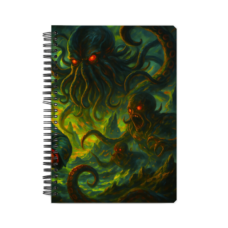 Dare to scribble beside the cosmic abyss! Presenting Sovan Kapuria’s official merchandise – an A5-sized, wiro-bound notebook featuring the epic battle between man and monster. On the front: our hero (Sovan himself?) armed with a blade, charging into the unknown. On the back: ancient horrors rise, straight from a Lovecraftian nightmare. Whether you’re plotting your next thriller, sketching tentacles, or writing down grocery lists with doom in mind — this is the notebook for you.